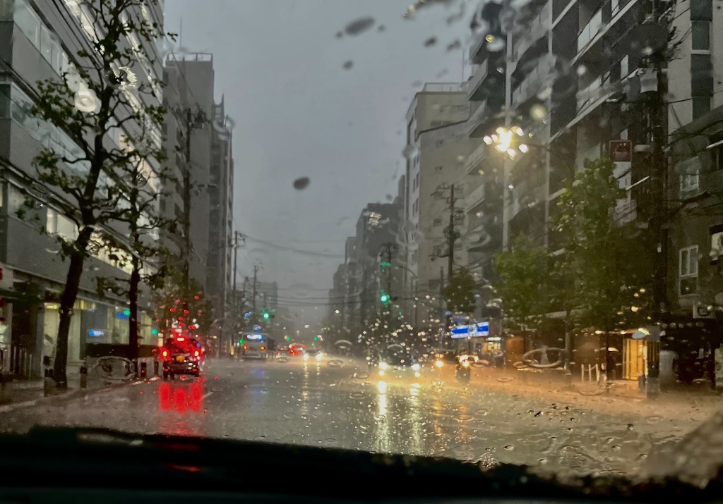 夕方4時ごろ車で四条大宮あたりを走っていると晴れていたのに急に真っ黒な雲に覆われた瞬間、突然にすごい雨、ごろごろと雷が鳴るはすごい音でたたきつける雨の中には大粒の雹(ひょう)が混ざってフロントガラスに当たり跳ねまわっていました。