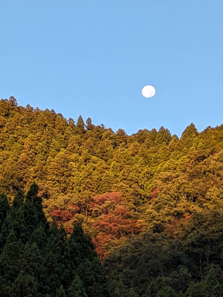 京都鞍馬二ノ瀬の朝6時半頃、西の山に月が!