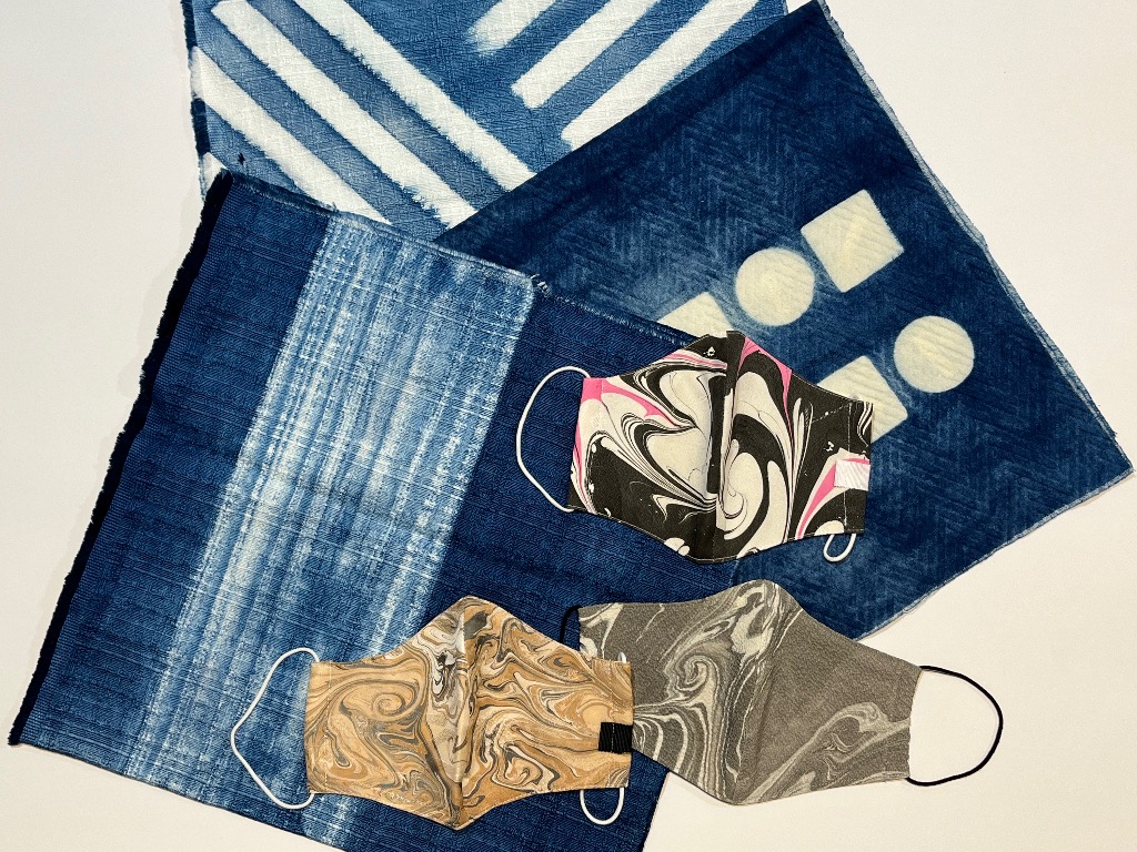 画像:和雑貨用藍染生地とマーブル染で制作したマスク達
