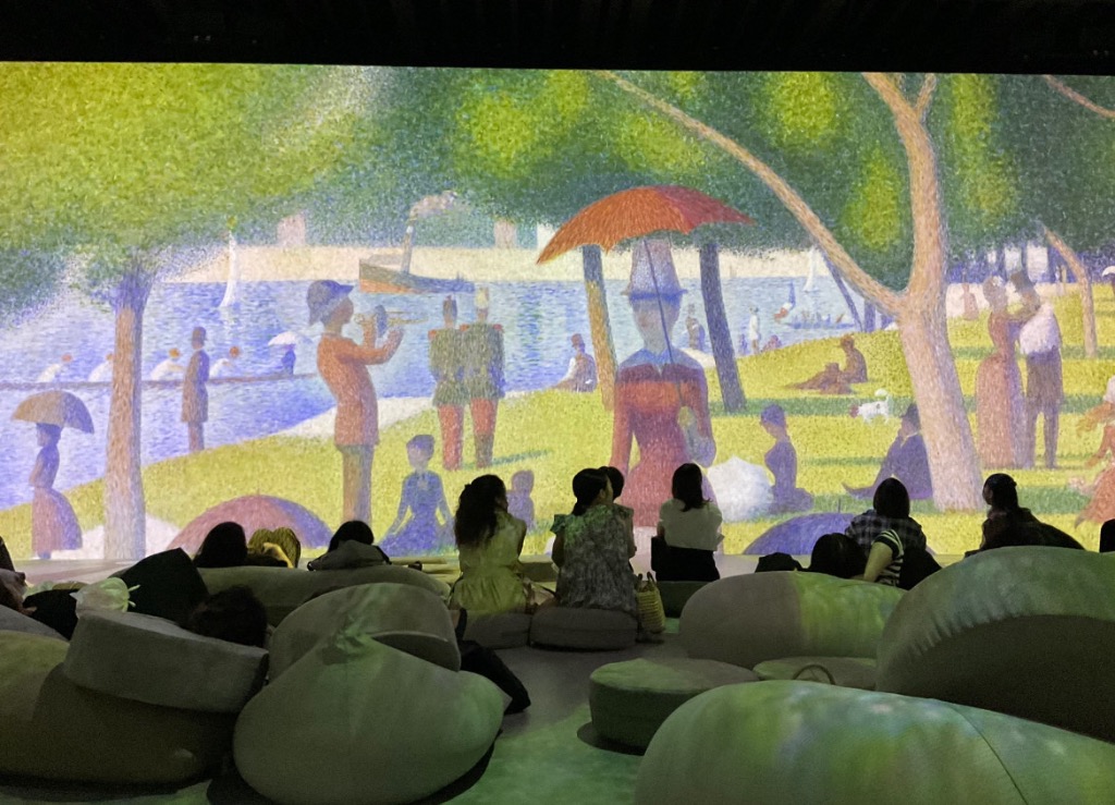真っ暗な通路を行くとクロスが交差するカーテンを開けると巨大な空間と大音響、印象派のゴッホの「種をまく人」の黄色い夕日の油絵の筆の一タッチ一タッチがすごいスピードで剥がされていき、またすごいスピードでゴッホの自画像に戻ったら、替わってスーラ―の点描絵の無数の色の点描が竜巻の如く大きな画面に吸い込まれ「日曜日の午後」の絵画に替わっていく・・・・・・というように観賞する絵画から、体感する絵画の会場であるという売りである。