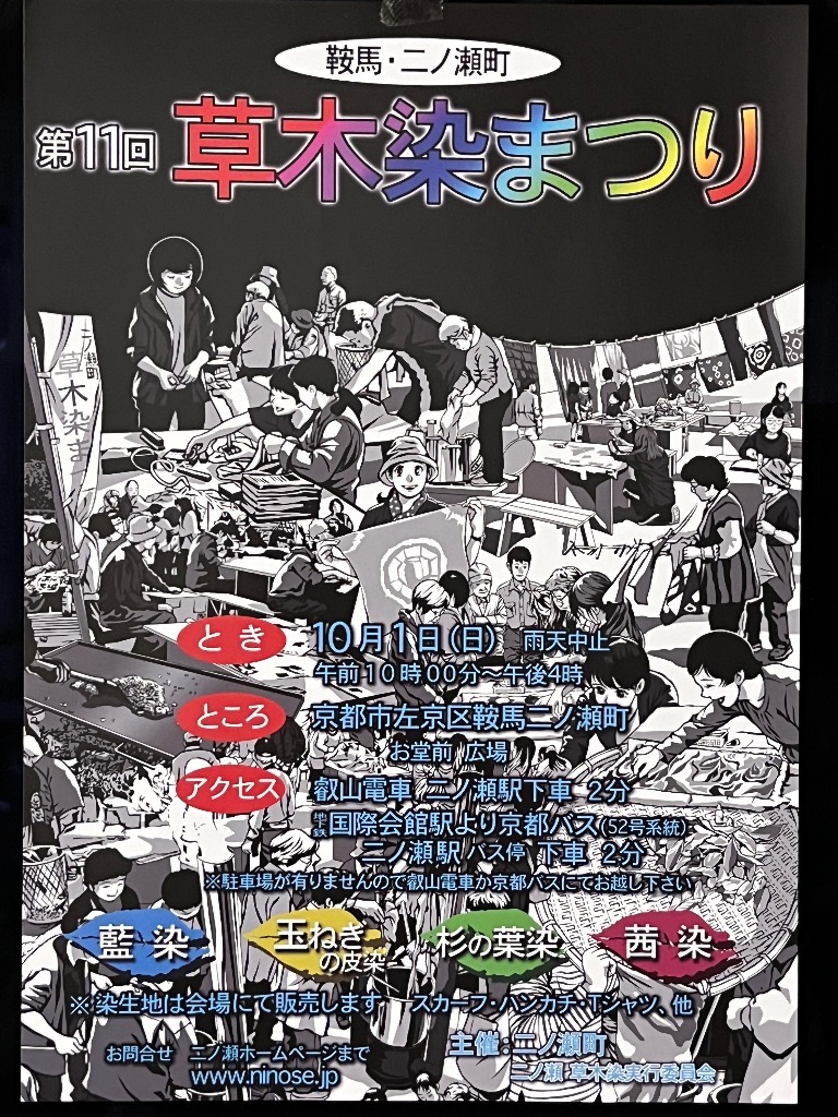 毎年10月の第一日曜日にここ京都鞍馬の二ノ瀬町では「草木染まつり」という自然から摂れる「色」で村人達と遊ぶ行事をしています。コロナ禍の期間は中止にしておりましたが、今年から復興する準備を先月から始めています。