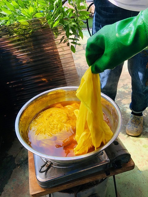 キハダ(黄檗)の木の皮から抽出した黄色は少し黄緑かかったレモンイエローのきれいな色に染まりました。(……私は和雑貨にも使ってみようと興味を持ちました。)