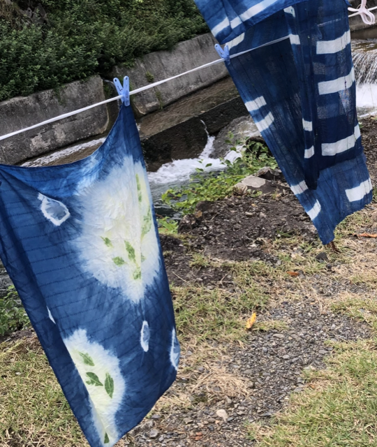 藍染をした布に上記素材を抽出した染料に重ね染めをしてミドリ色を染めるのが昔ながらのやり方です。厄介なのは焙煎液で定着させなければならないのでこの焙煎液に浸けることでミドリの色はまた変色していきます。水彩絵の具で混ぜ合わせて出すのとは違い変化を読みながら色出しをしなければなりません。私の頭の中には和雑貨のトートバックやファッションスカーフやヨモギで染めたマスクでも創ろうか・・・・・・⁈
