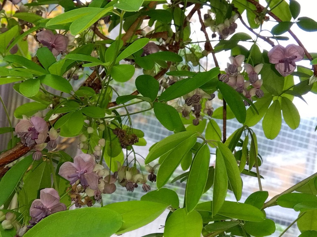 ベランダに絡むアケビの花、今日の雨で桜は終わりますね!寂しいですね。