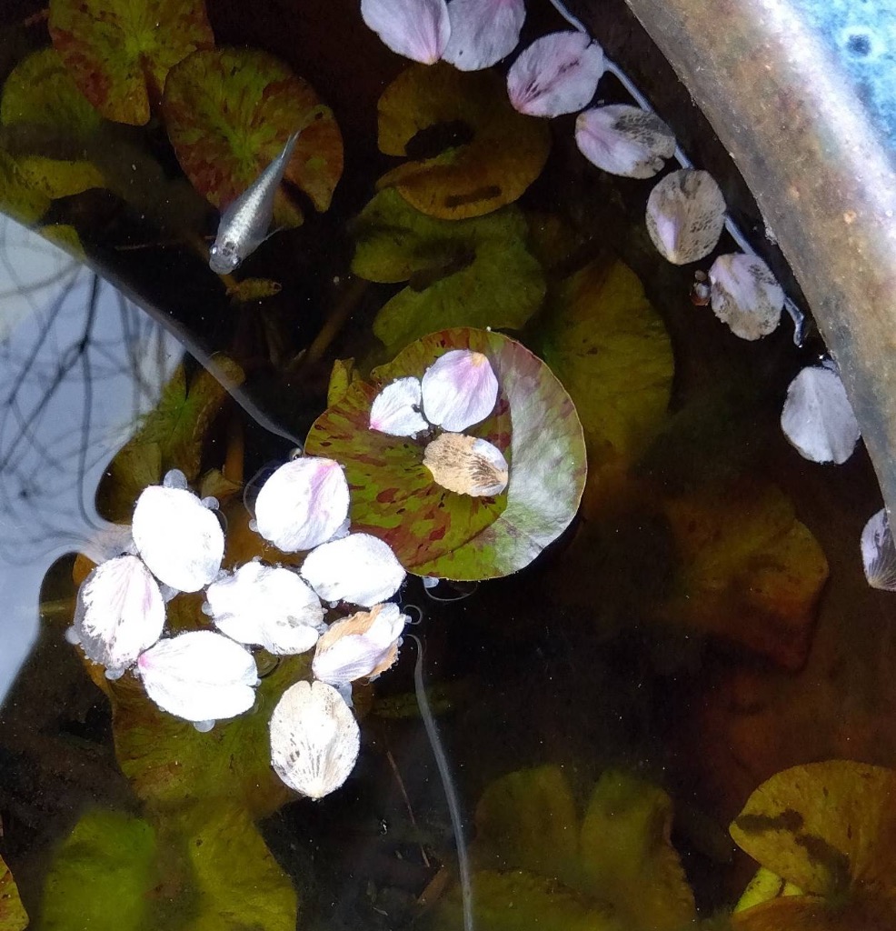 家の扉の隙間から入ってくる、メダカの鉢の中にもヒラヒラとソメイヨシノの桜は木に咲いていると白に近いピンク色ですが、花びらは元が濃いピンクでボカシが入ってかわいい。