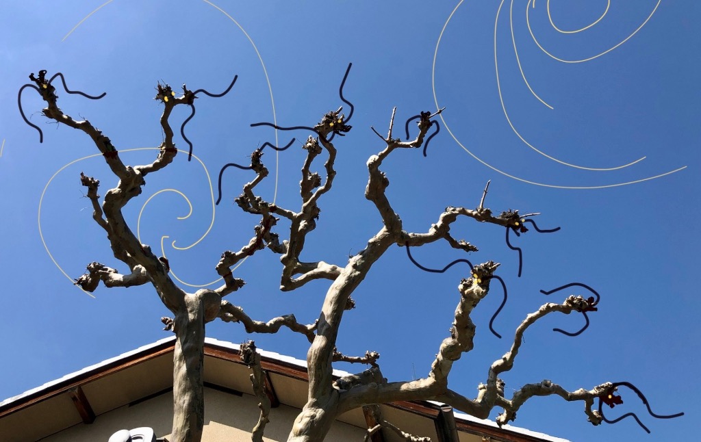 青空に面白い拳の集団に見えた木に、iPadペンで『九龍』に見立てて髭と眼を入れてだまし絵にして見ました。