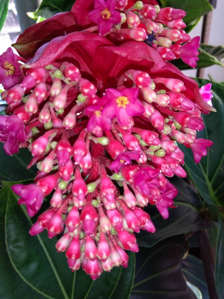 我が家のメデニラマグニフィカは花が開き、次々と蕾が大きくなって少しずつ色づいてきました。