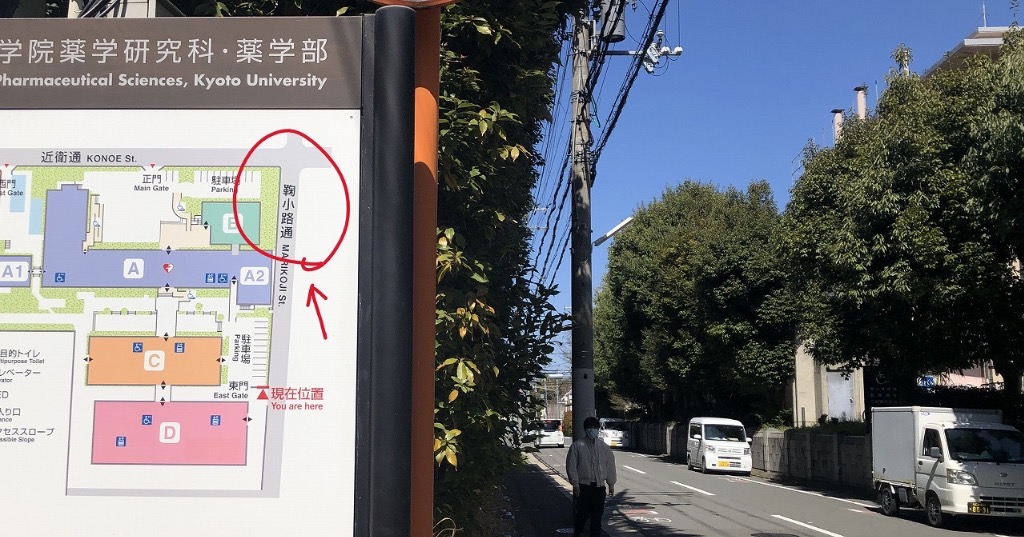 下手から右側は京大病院の病棟が、左側は京大薬学部の立派な建物が建ち並ぶ中、道路標示が目に入りました、とても素敵な名前に惹かれましたのでご紹介しておきます『鞠小路通』と書かれていました。こんなところにも公家文化の名残りの文字のつく素敵な名前の通りがあるものだと気づかされました。