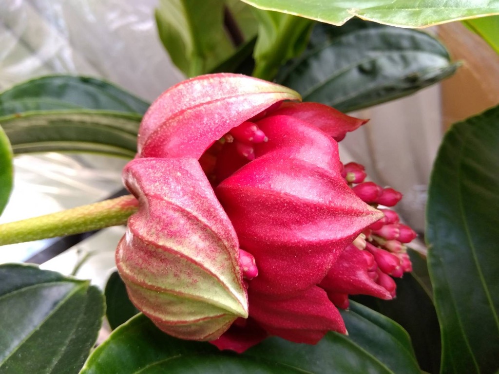 我が家のメデニラマグニフィカも蕾が大きくなり、綺麗な紅色に染まって、かわいいファッションでインスタ映えしています。