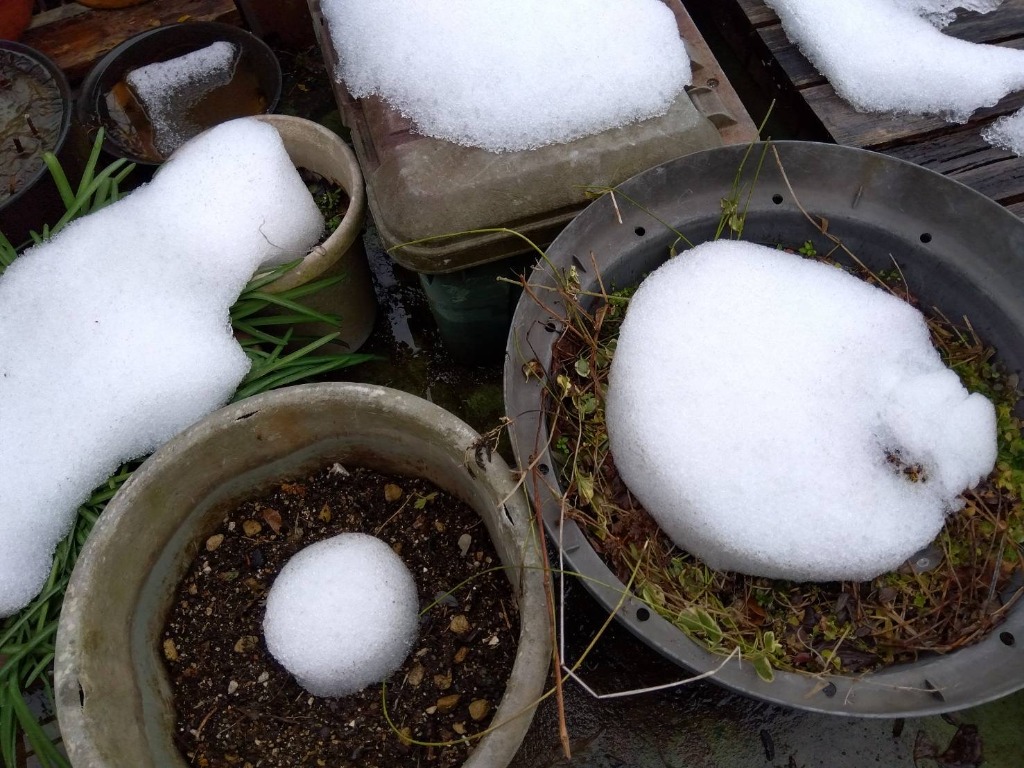 京都鞍馬二ノ瀬町、ベランダの雪も後わずか、植木鉢に残りが!