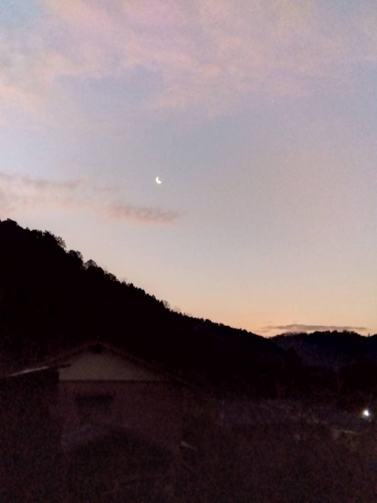 今朝の空、朝日の昇る前のうす茜色三日月が綺麗!