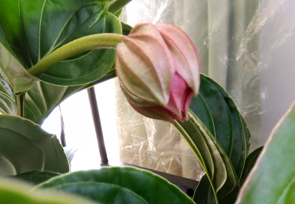 今日のメデニラマグニフィカ、部屋の片隅のビニールハウスのなかに電気湯たんぽを入れ、寒さをしのいでいます。