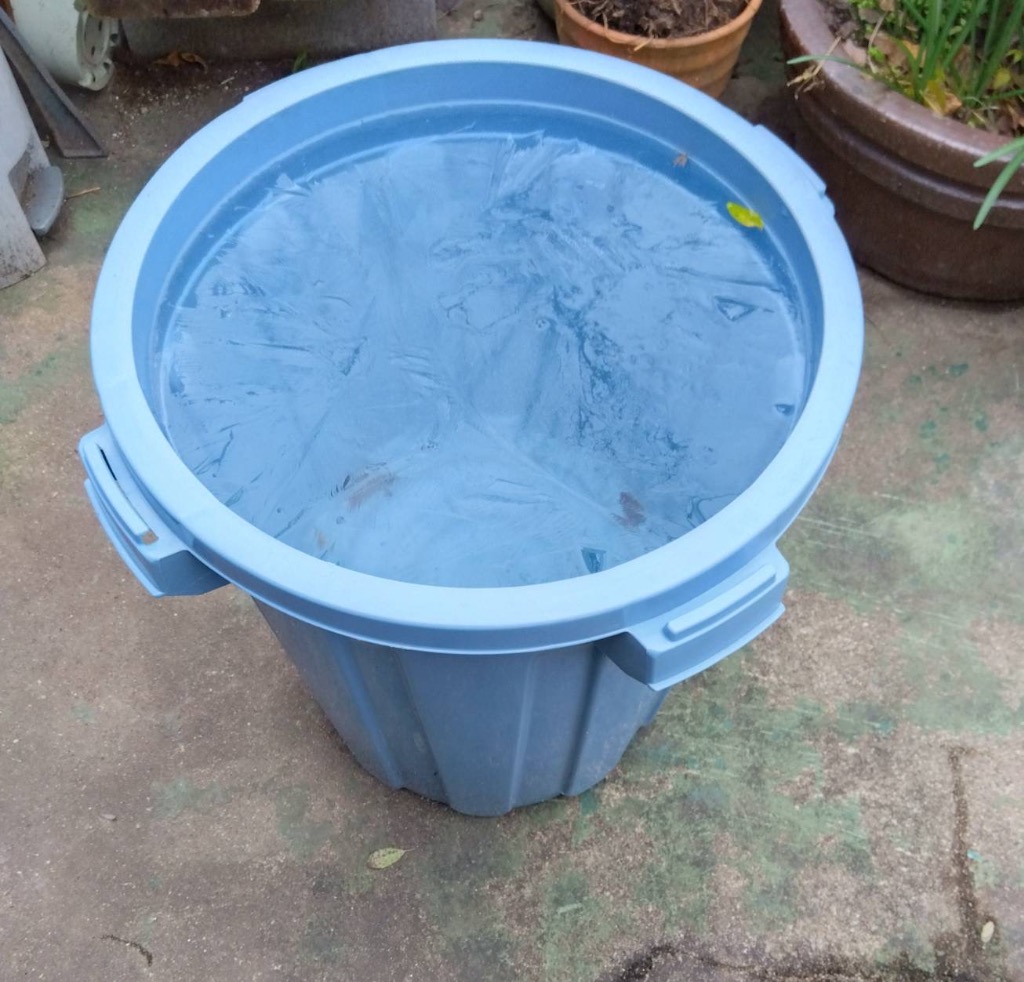 朝、たるの水が厚く凍って 周囲の木々や葉も凍り付いていました。
