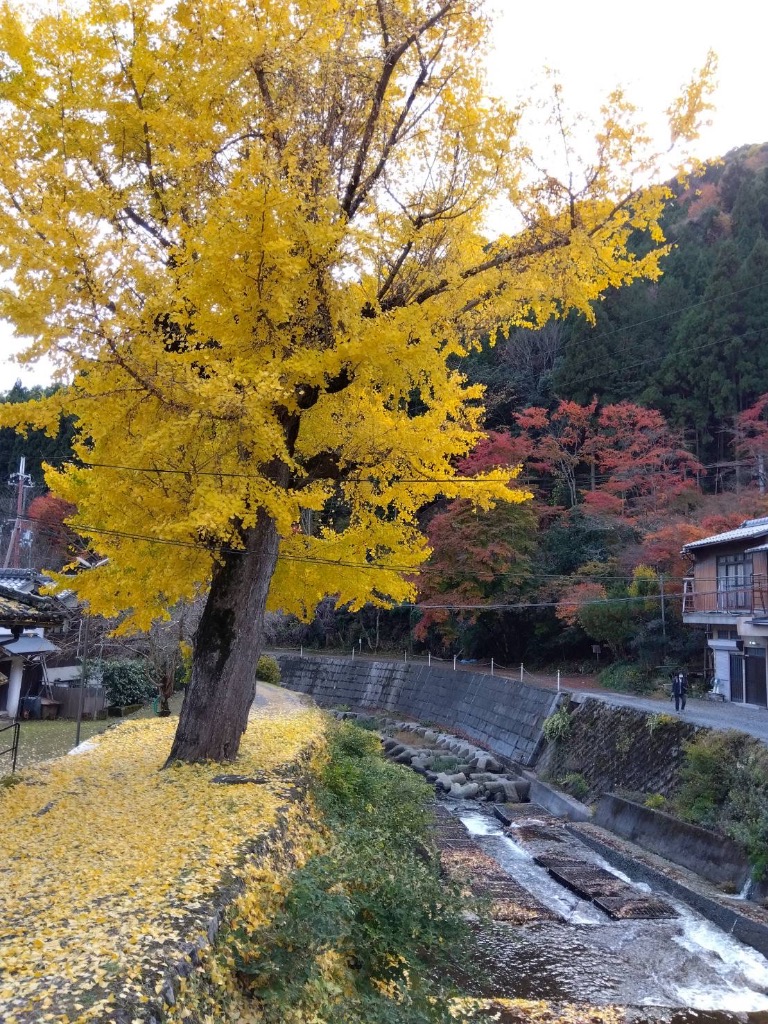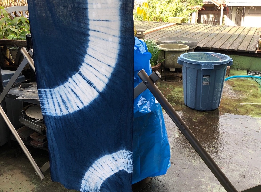 あいにくの雨の中でしたが、1人染めもの教室に来て下さいました。朝から藍を建てました。10日前に新しく建てた藍でしたが蓋を開けご機嫌をうかがいながら助剤を入れどうぞ上手く建ちますようにと祈りながら1時間ほど待って見てみますと薄く表面に膜を張り泡立って来ています。う〜ん、愛おしいという思いがわいてきます。試し染めをすると、なかなか良い色ですね~。主人も手拭いを1枚染めました。なかなかセンスの良いインスタ映えする1枚です。さすがデザインの仕事をしているだけありますね!お客様の女性は見本を見ながらバンダナと手拭いを染められ、又色々なものを染めてみたいと言って喜んで下さいました。電車は毎日、沢山の人が京都鞍馬へ貴船へと最後の秋を楽しみに乗って来られます。人は秋のファッショんから冬のファッションへ衣替え。二ノ瀬も桜の葉は散り、紅葉も散り始め、秋の終わりを感じますねそれでも銀杏は綺麗! まだまだマスク要りそう。