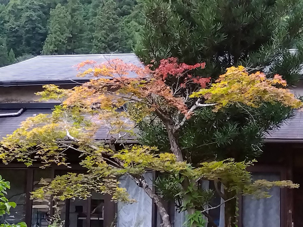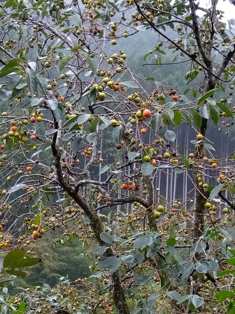 昨日の台風の後、寒いです。又温かさが戻るという予報ですが、台風の風でどの木も葉が落ちたり、傷んだりしています。ブログのネタ探しに歩いていると、鹿の鳴き声が近くの山でしています。花が咲くはずのホトトギスの先がかじられています。鹿です。今年は、咲かないのでしょうね?残念ですね。ここらを鹿が歩いたのでしょう。今朝は、鹿の鳴き声が、昨日は鳥の鳴き声が、外へ出て見ると、何処で鳴いているのか?声のする方を見るのですが、姿は見えないのです。何時も鳥の正体が分からないまま飛んで行ってしまいます。そろそろ秋の気配が、裏のお家の小さな渋柿、ころ柿が赤くなり始めました。この柿は、二ノ瀬では柿渋にしていたそうです。今は甘くなればヒヨドリのごちそうに。もみじも先が色づいて来ました。