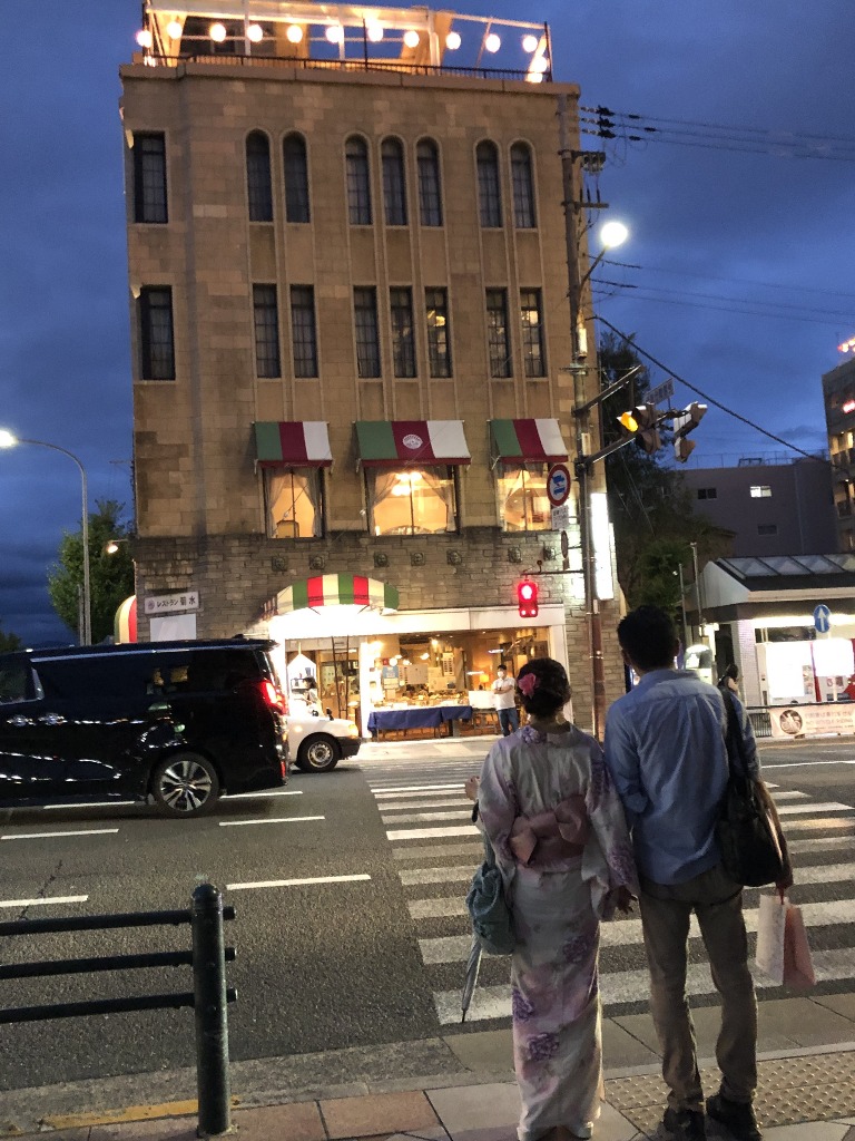 南座の前での待ち合わせも珍しいことで、南座の看板や人通りを眺め、南座の前にある喫茶『菊水』の屋上を見上げると彩のいい提灯が下がり、昔ながらのビヤガーデンの雰囲気。