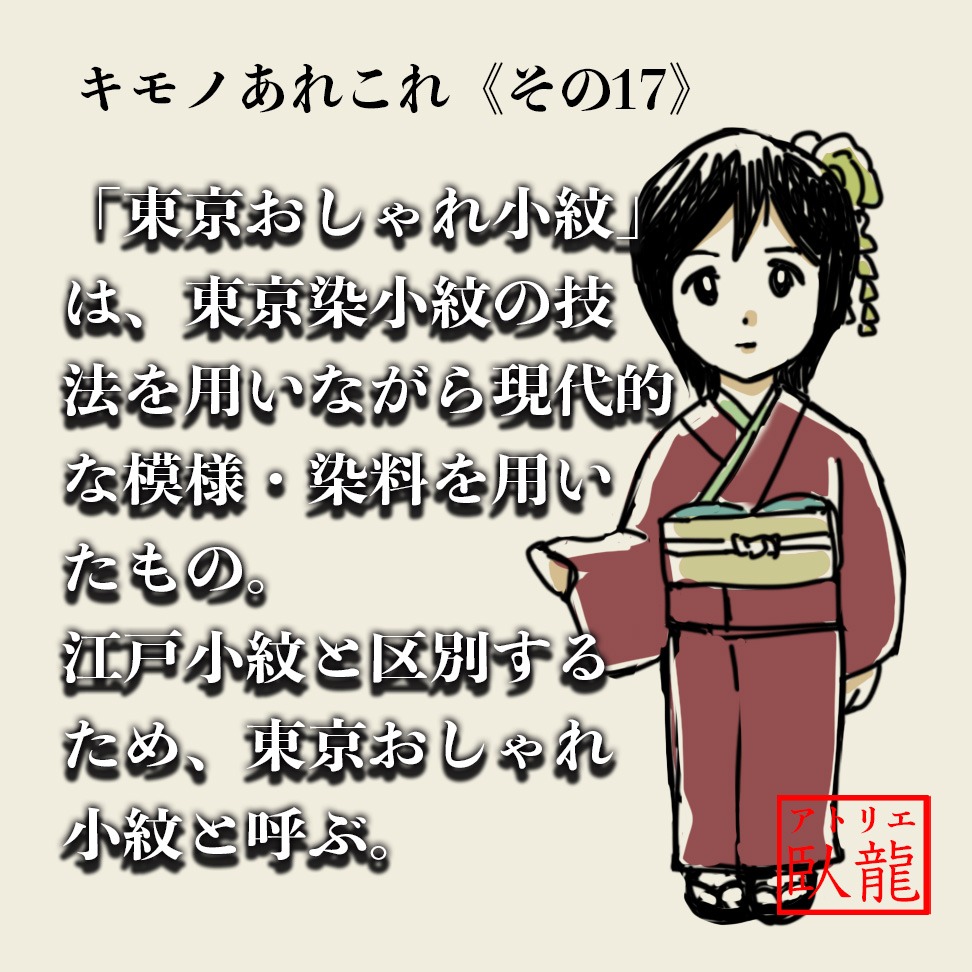 「東京おしゃれ小紋」の他に、「京小紋」は17世紀初頭の武士の裃を起源とし、明治初期に単色から彩色へと変化しながら京友禅と互いに影響しながら技法が完成されたそうです。