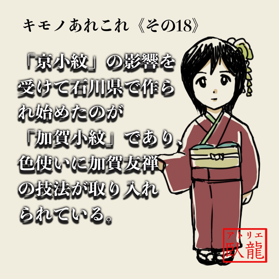 また、「京小紋」の影響を受けて石川県で作られ始めたのが「加賀小紋」であり、色使いに加賀友禅の技法が取り入れられています。
