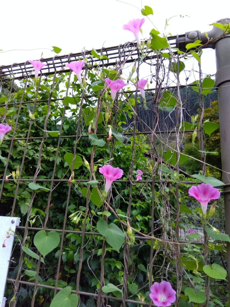 夏の花、朝顔、日本の朝顔と葉が違うよですが、毎年種が飛んでガレージの柵にツルが絡まってさきます。