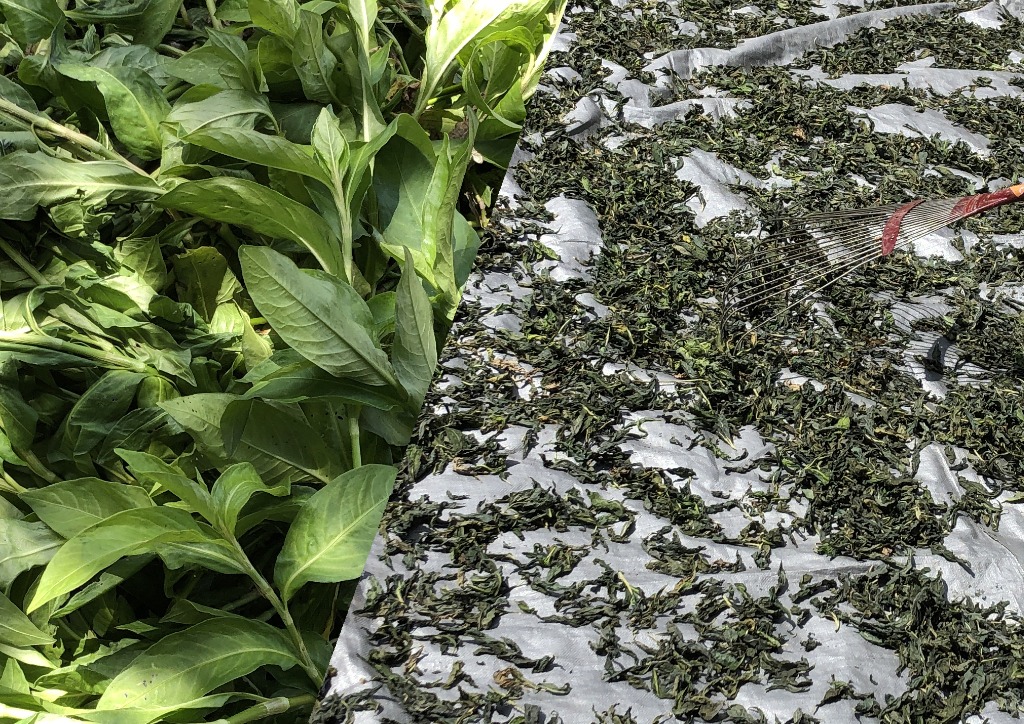 4月初めに種まきし、苗を畑に植え替えて天気のいい日は朝夕には水を与えて育ててきました。それが立派に育った8月初旬に刈り取り、葉を摘み天日干しし備蓄していきます。