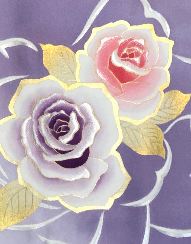 私は京都鞍馬で着物や和雑貨のデザインをしていますので、いろいろな花のモチーフの絵を描きます、菊、桜、牡丹、燕子花など日本の花が多いのですが、少し洋風でオシャレでファッション性をと考えると和装の中ではバラの花がインスタ映えするように描くことが有ります。
