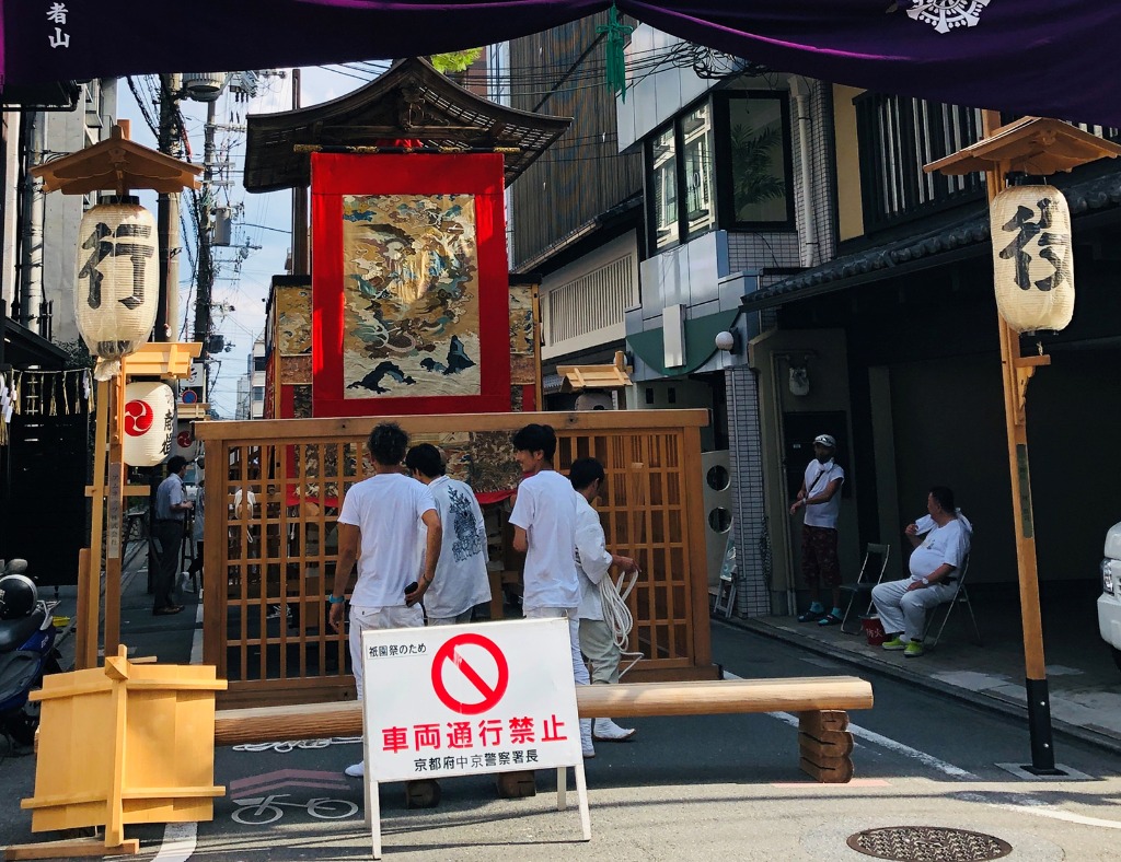 筋々に準備中の山がまだ骨組みのままちらほら見えます、各山で法被を着て手には荒縄を以ってこの炎天下の中でマスクをしながら作業をしている、京都の心意気を感じます。