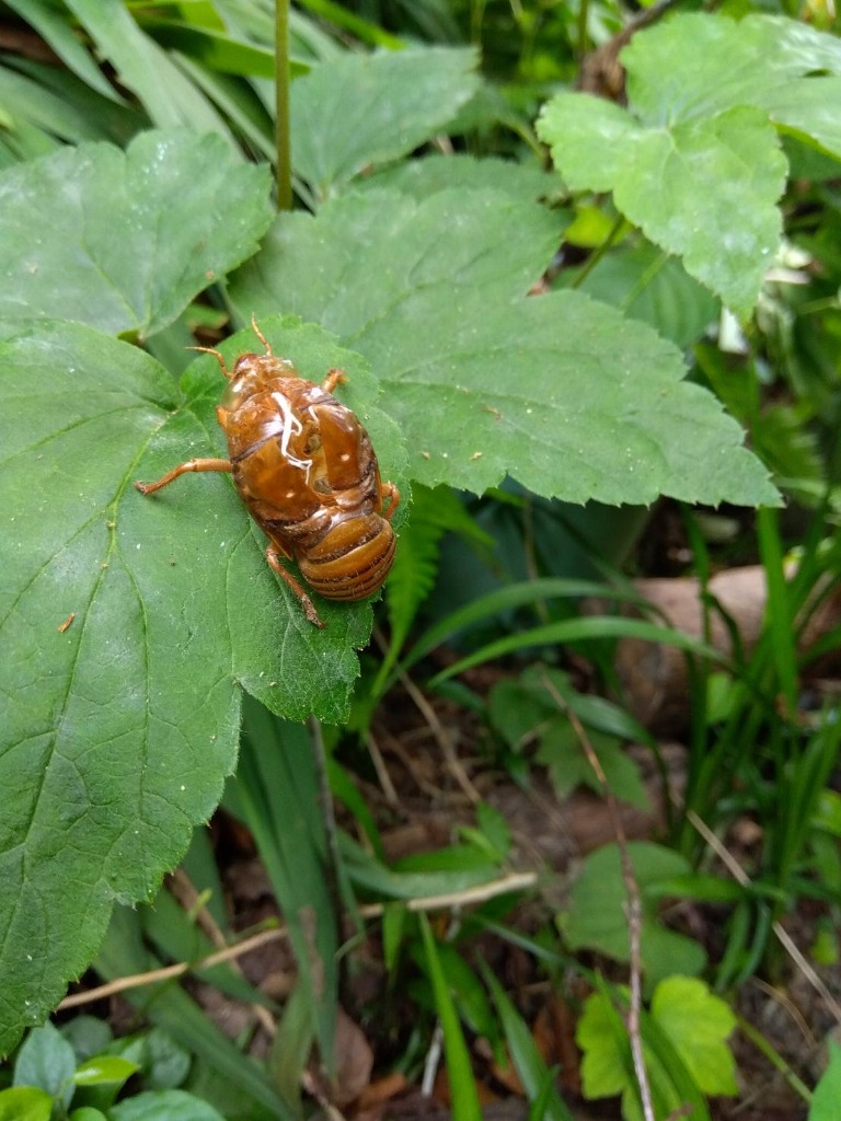 庭にはアケビの実、柿の実と実りの秋の気配を感じさせてくれますが、秋明菊の葉に蝉のぬけがらが有りました。