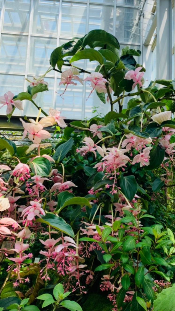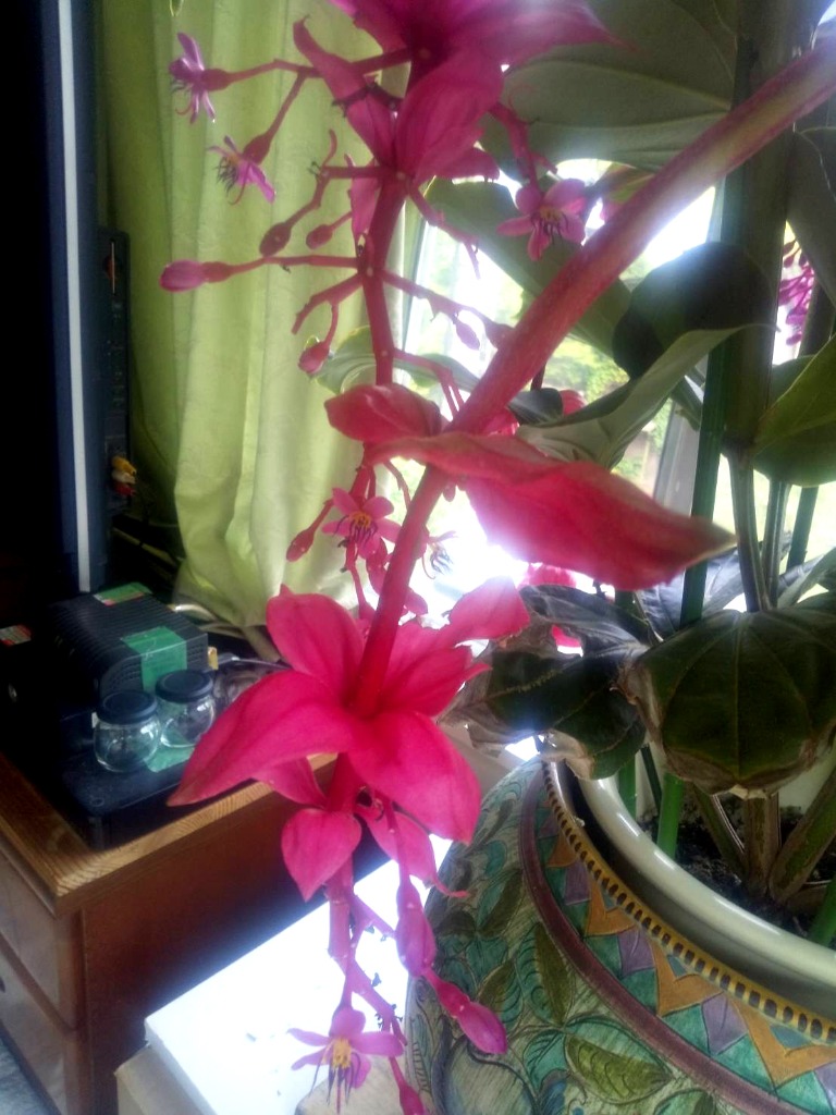 私の家のメデニラはメデニラフラメンコ、濃いピンク、ピンクというより紅色、植物園のはメデニラマグニフィカ、美しいピンク色です。