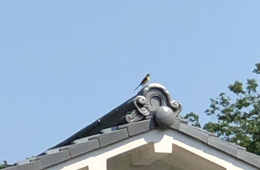 耳を澄ますと、チュッチュッと小鳥のさえずりが聞こえます、目を凝らして鳴き声の方を見上げるとお隣さんの鬼瓦の上で、セキレイが晴天の青空に向かって泣いています、携帯電話のカメラの望遠を最大にして撮影してみました。