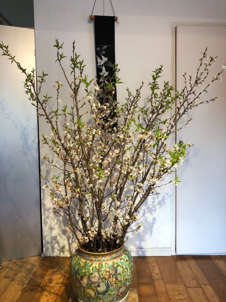 家の中でたくさんの花芽から桜を咲かすような出来事は初めてのことで、この上ない贅沢なことはありません……と大喜びで、この桜にふさわしい鉢を探し活けました。