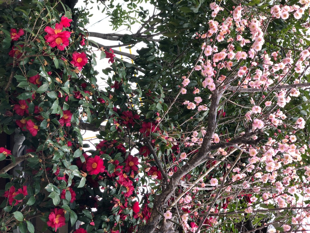 見終えて、ふらっと平安神宮の東寄りの路地に入り、京都鞍馬では見られない民家が立ち並ぶ一軒のお家の塀越しに満開の梅と山茶花の色とのコントラストが目に入りインスタ映えするワンショット…とッ…!