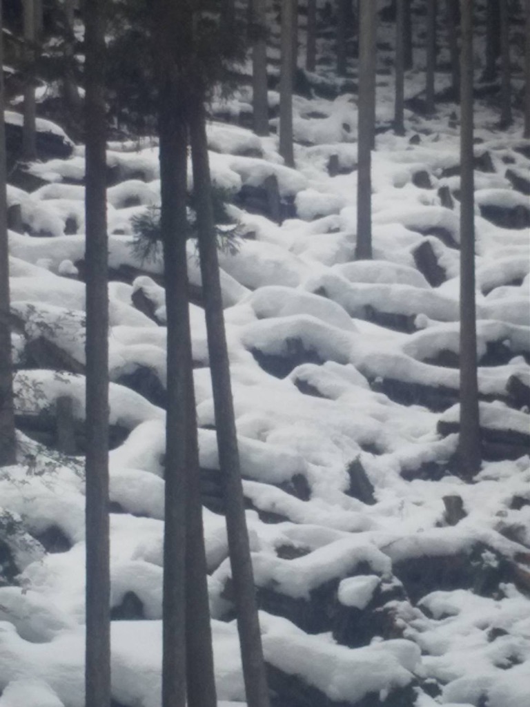 いつ降った雪なのか、3年前の台風の風で倒れた杉や檜がそのままになっているところ、まだ今も伐採しているところ、木を伐採して木の株だけになっているところ、伐採した後を植林しているところと、面白いほどいろいろです。