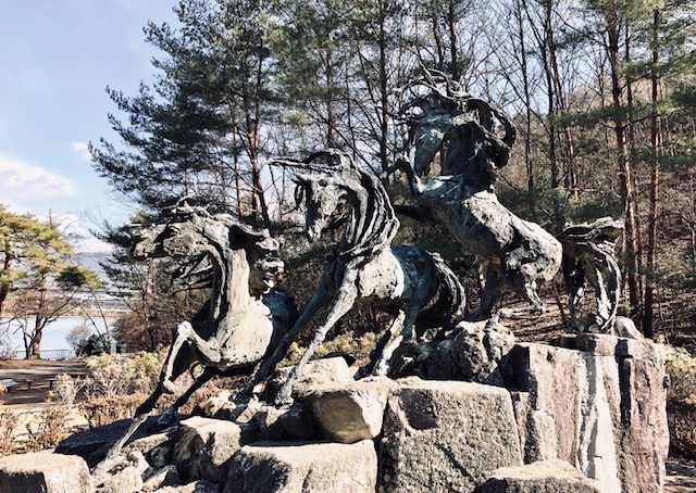 さて、その公園の一角に石で囲まれ勢いよく跳ねている「重なり合った3匹の馬」の彫刻が、周囲の枯れた樹木と同化し目に入りました、同化している理由は馬の立髪が勢いよくなびいている様が小枝のように見えるからでしょう。