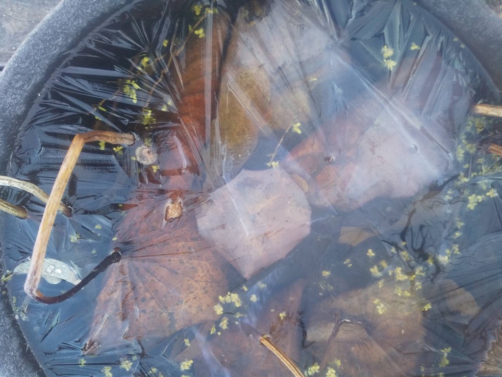 バケツの水は凍り、蓮の水も凍り、昼は雪が舞っています。