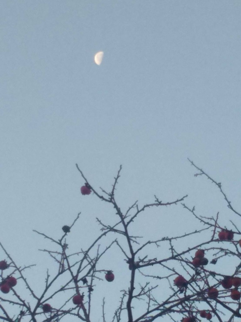 今朝は、お月様が柿の木の上に、半月ですが静かに私達を見守って下さっている様です!