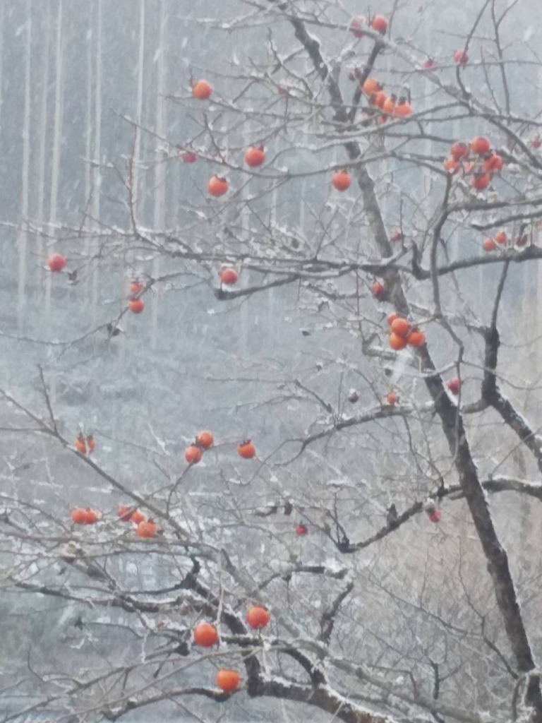 裏の小さな渋柿が赤くなって雪の中に赤い実がインスタ映えします。
