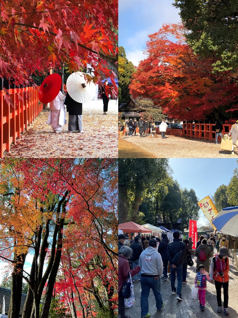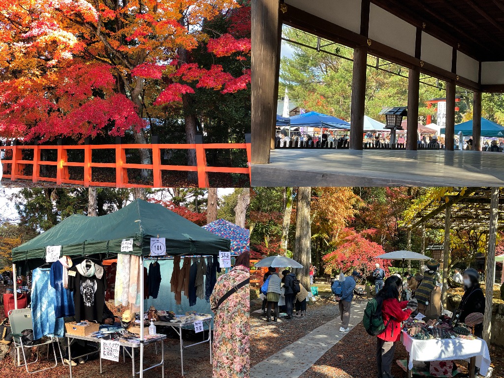 神社の境内の樹木の紅葉と出展者の和雑貨、工芸品、ファッション、食品、