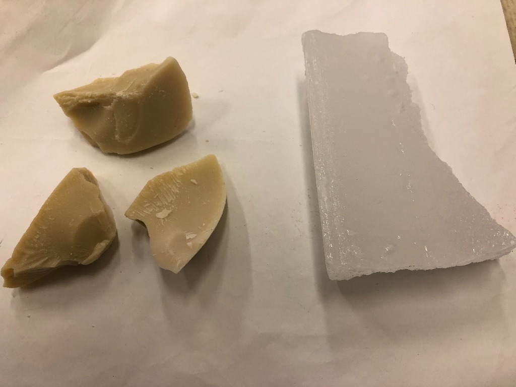 写真1 2種類の蝋 左―木蝋(やわらかい) 右―石油系の蝋