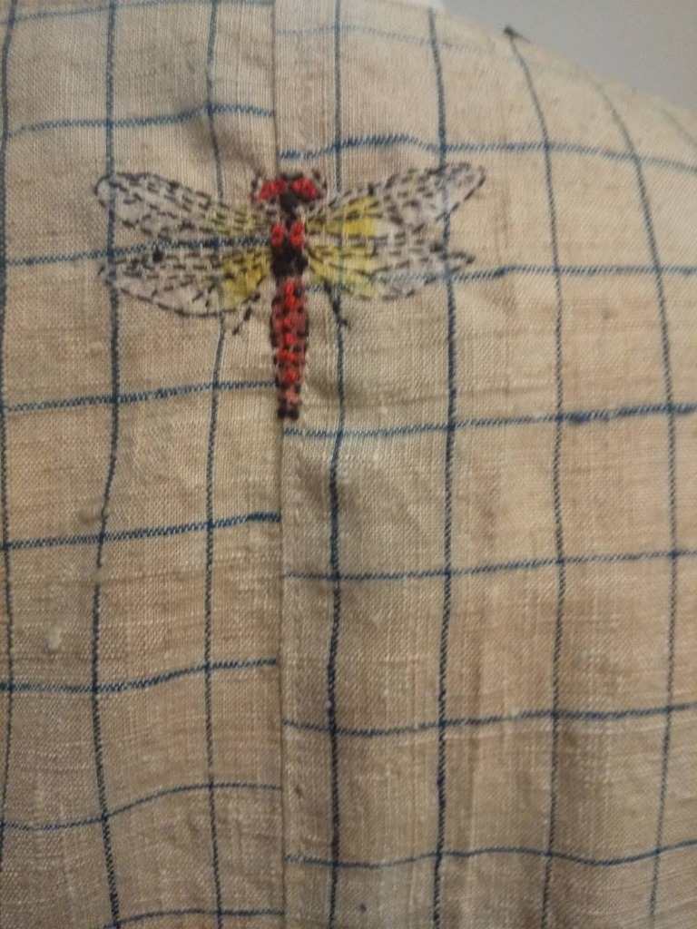 背中には、背守りにトンボを布絵具で描いて、上から刺繍をしました。