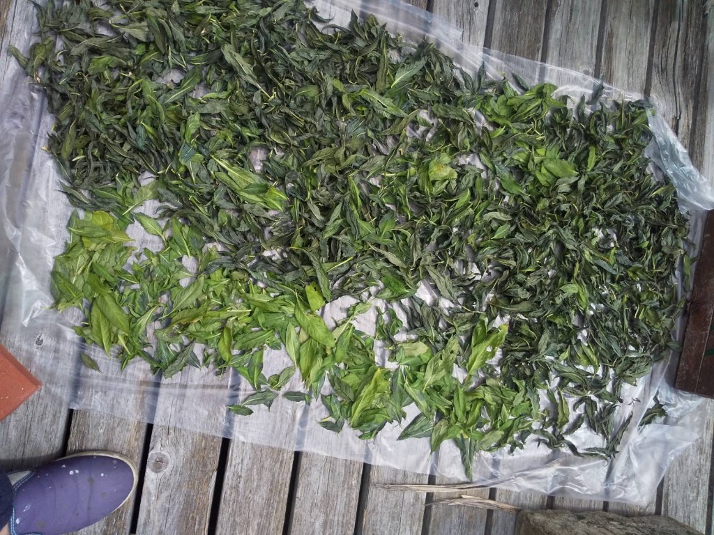 「たで藍」は、春ごろに種を撒き、少し大きくなるとプランターに植え替えて、さらに大きく育つ夏ごろに刈り取って、干して保存し、煮詰めることで発酵させ、「藍」が染まります。