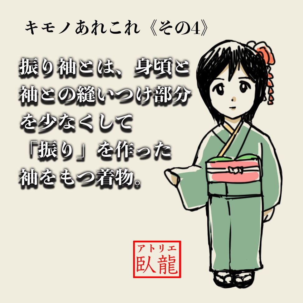 このうち薄綿を入れた振りのないものを狭義の「小袖」、薄綿を入れた振りをもつものを「振り袖」というそうです。