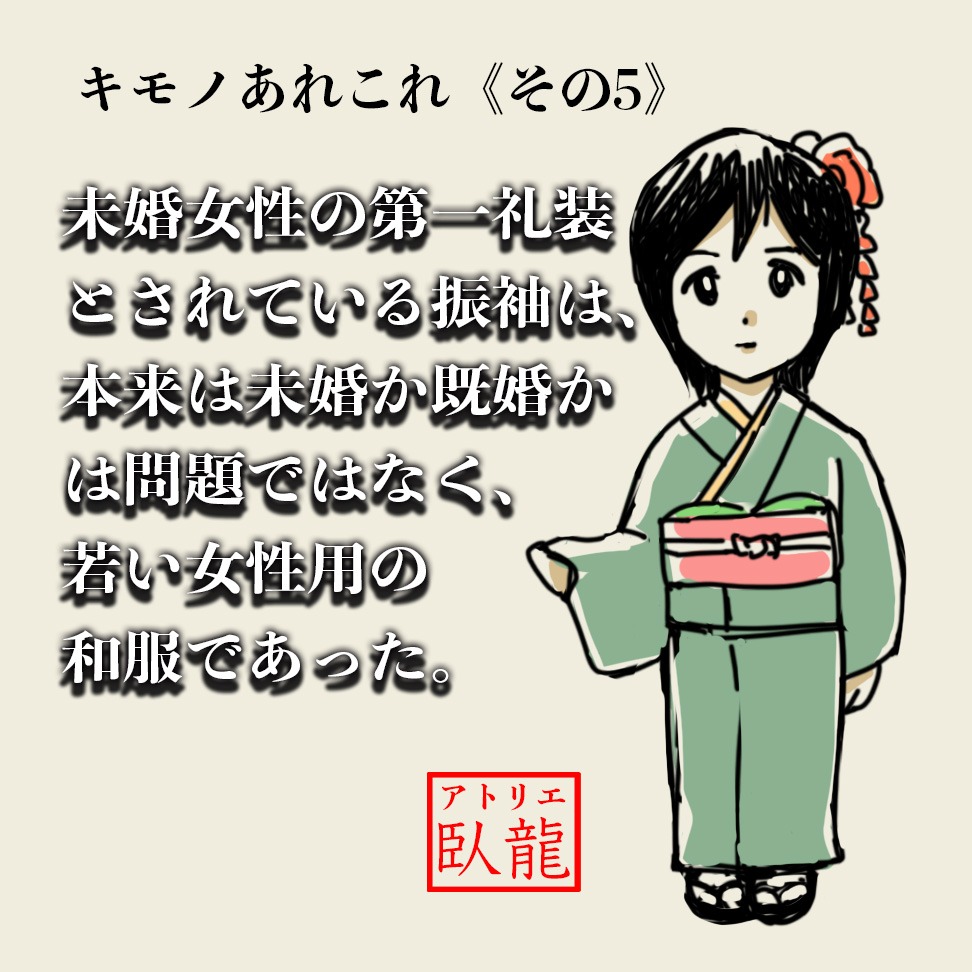 「振り袖」は、今では若い女性の、黒留袖や色留袖、訪問着に相当する格式の礼装であります。