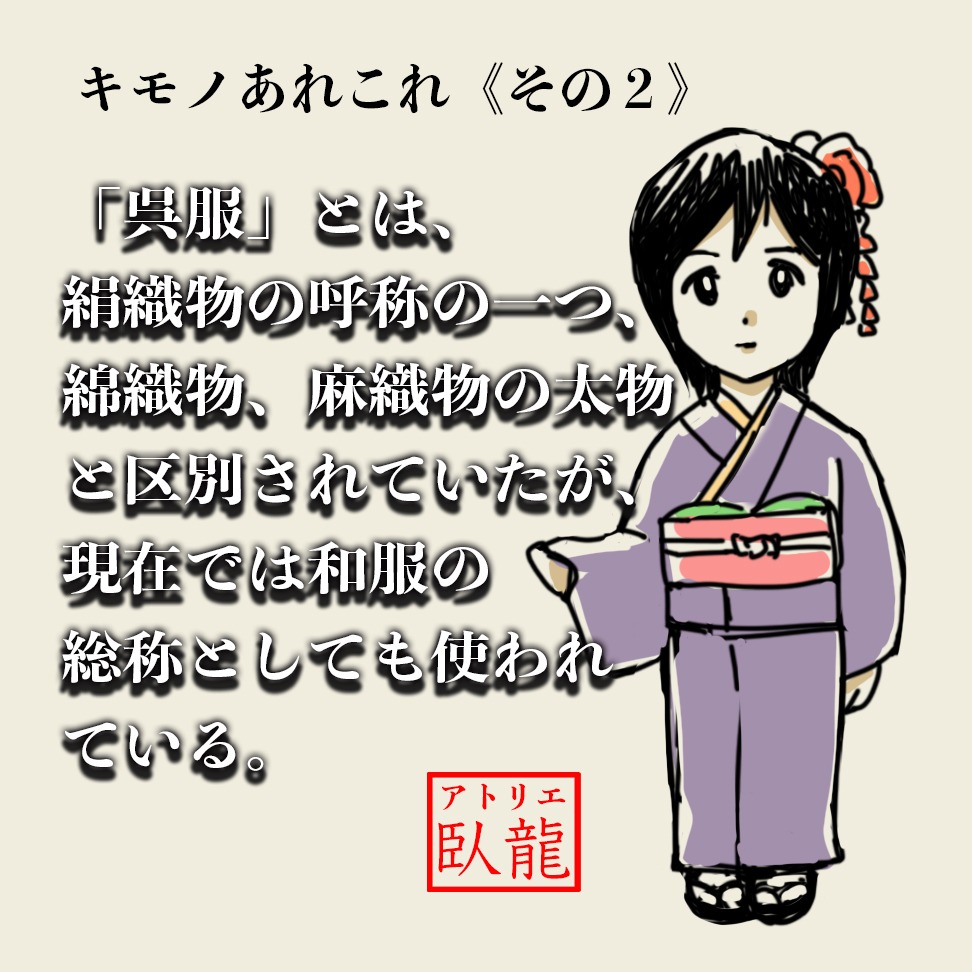 「呉服」という言葉は、中世の日本では織機の意味から、呉織・呉服(くれはとり)と呼ばれ、後に「ごふく」と音読されるようになったそうです。